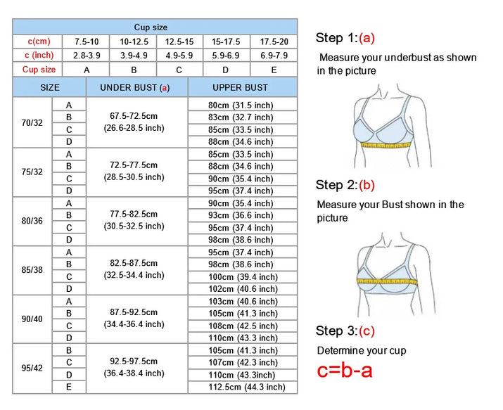 Das Bustier ist in verschiedenen Größen erhältlich, die ideal für Unterbrustmessungen von 60-80 cm sind, einschließlich 70A, 70B, 75A, 75B, 80A und 80B. Dies sorgt für eine optimale Passform und Unterstützung.